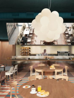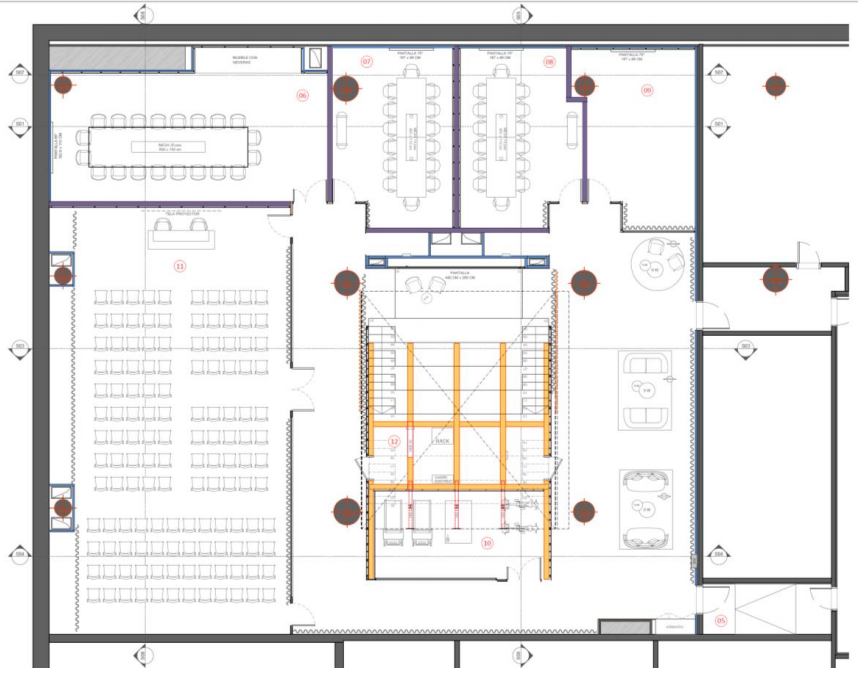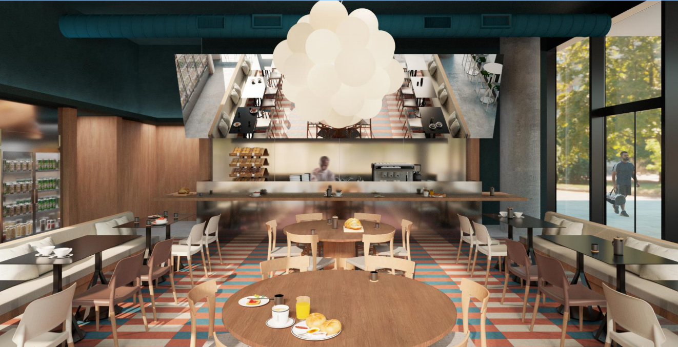 Auditorio, cafeteria, salas de reuniones y zonas ajardinadas que el edificio pone a disponibilidad de los inquilinos que generan comunidad y promueven innovación y generación de ideas.